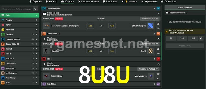 O 8U8U oferece uma grande seleção de opções de apostas em e-sports com probabilidades competitivas